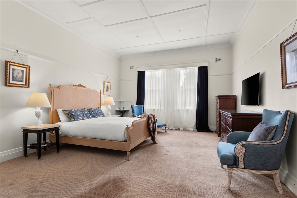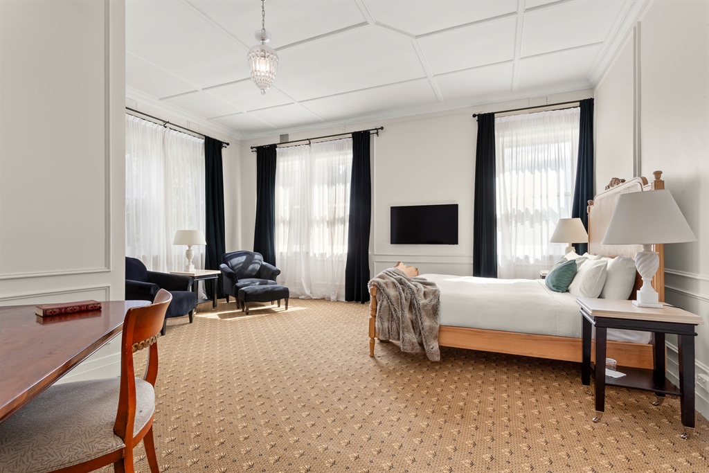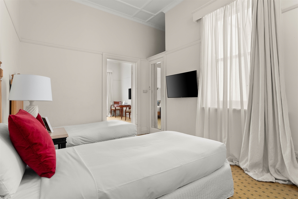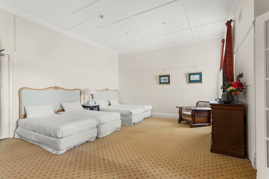 A cosy room including a king, queen or twin bedding with a large Art-Deco shared male/female bathroom. These bathrooms are only shared with the other heritage rooms on your fl ...