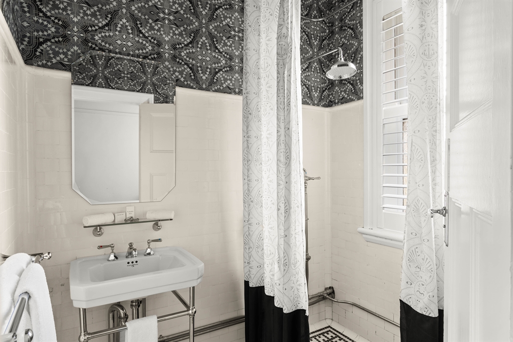 Twin single bedroom with its own Art-Deco bathrooms, including wallpaper from Catherine Martin, Perrin & Rowe, and The English Tapware Co. vanity basin. Paying homage, we have maintained and upgraded the original mosaic black and white tiles.