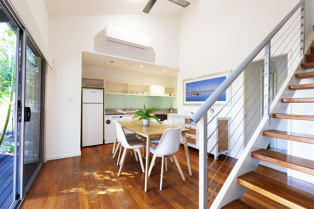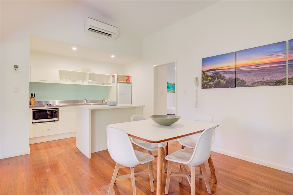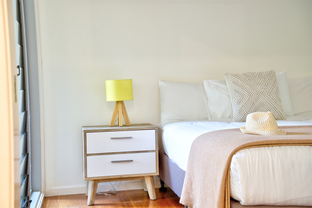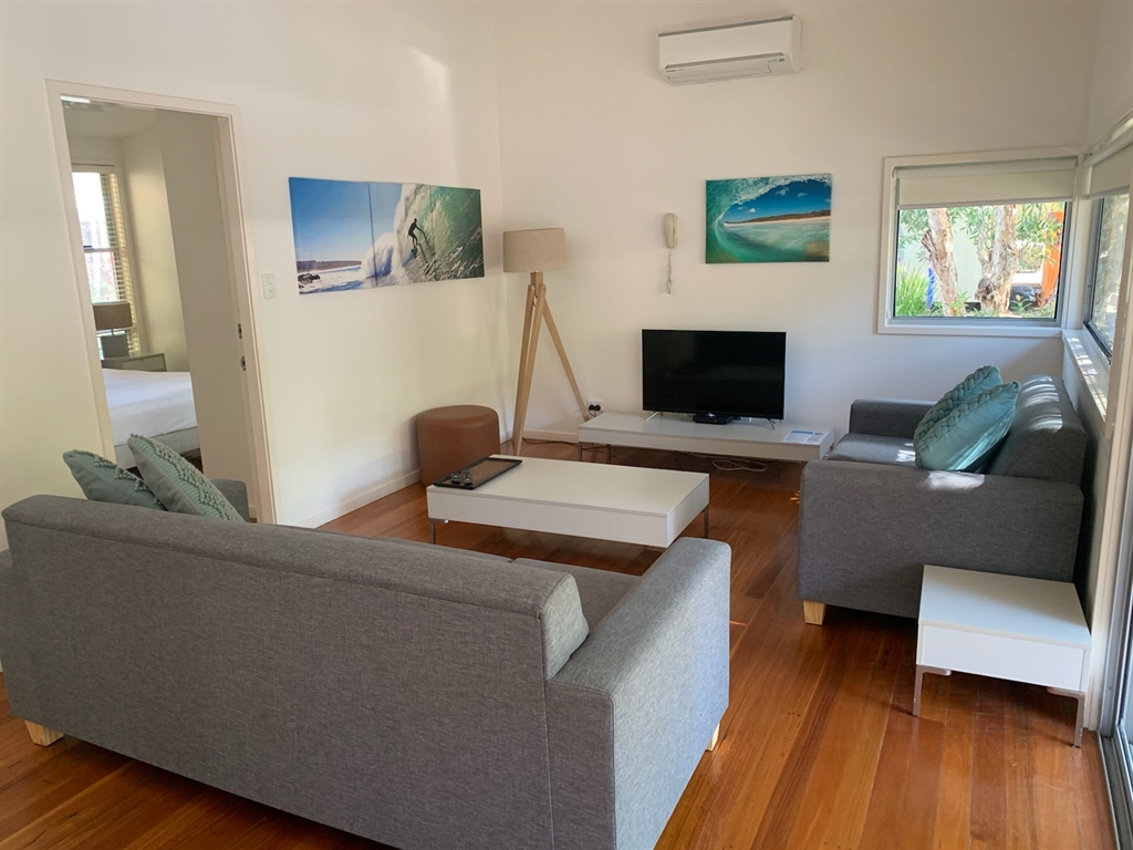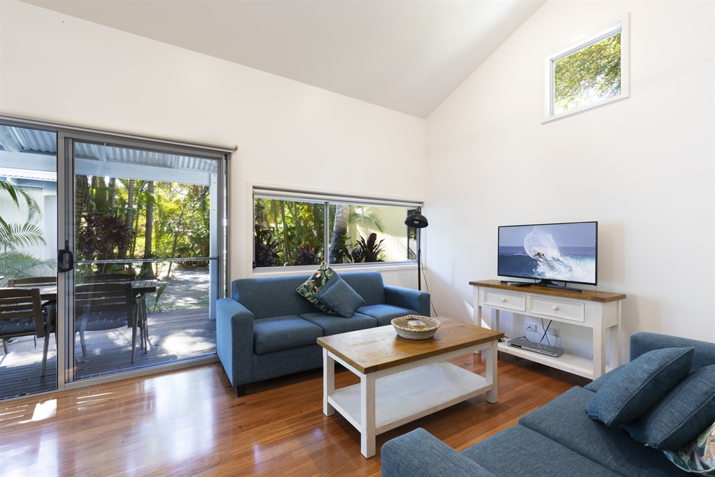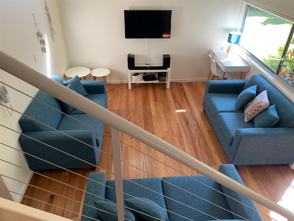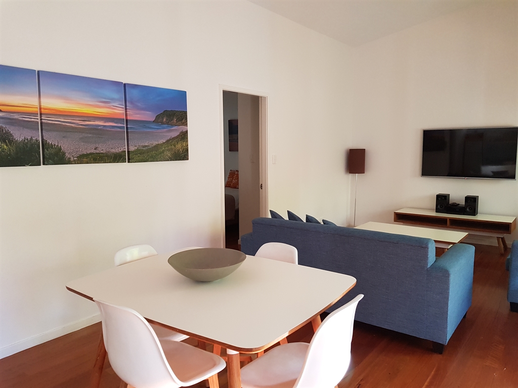 2-bedrooms, 1-bathroom, kitchen, laundry, open living area, private deck, and free outdoor parking. Ideal for families looking for a comfortable, laid-back coastal stay. Bedding: 1 Queen bed & 2 single beds