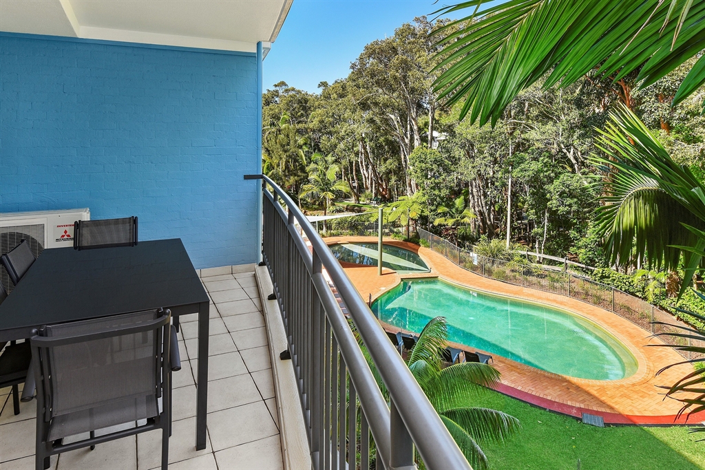 2 Bedroom Standard Apartment, consisting of 1 Queen bed & 2 Single Beds. The apartment, kitchen, laundry, bathroom and balcony overlooking our garden or pool area.
