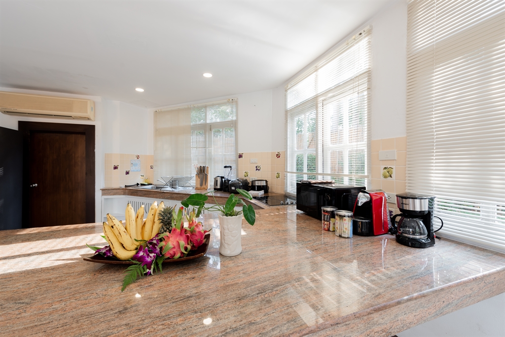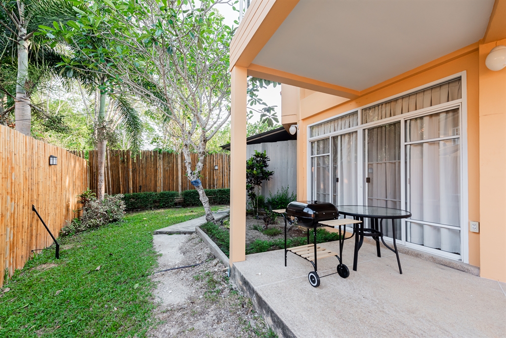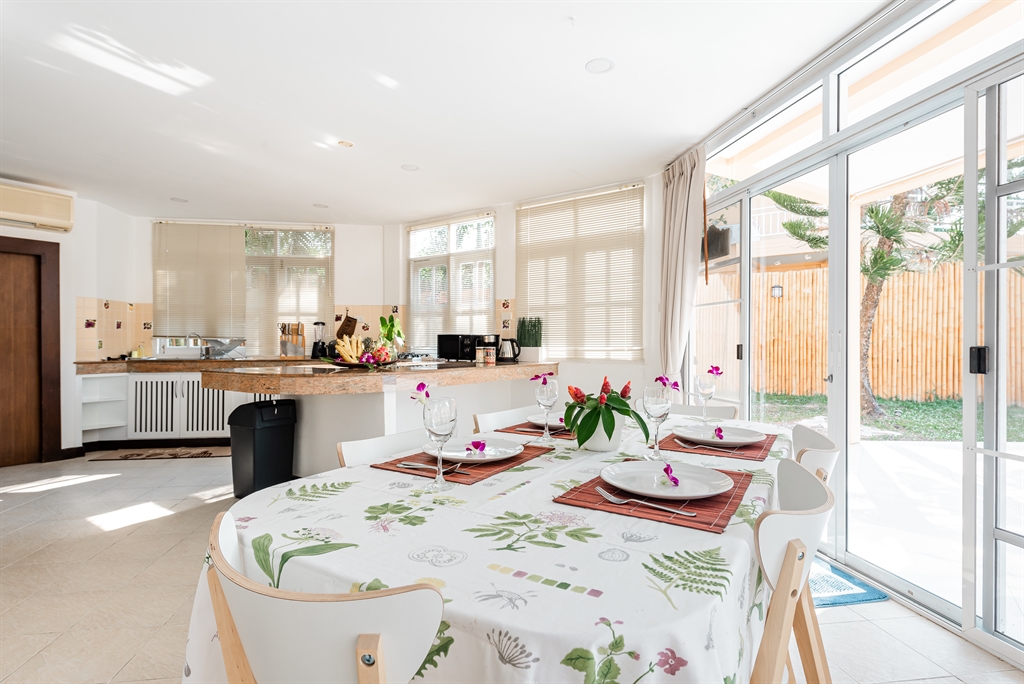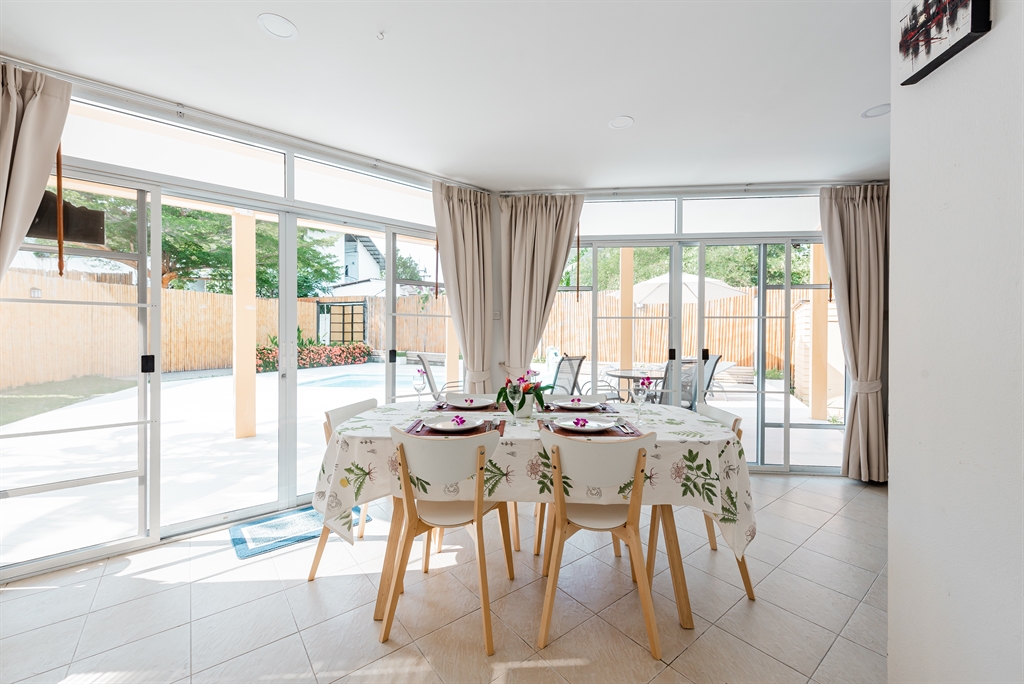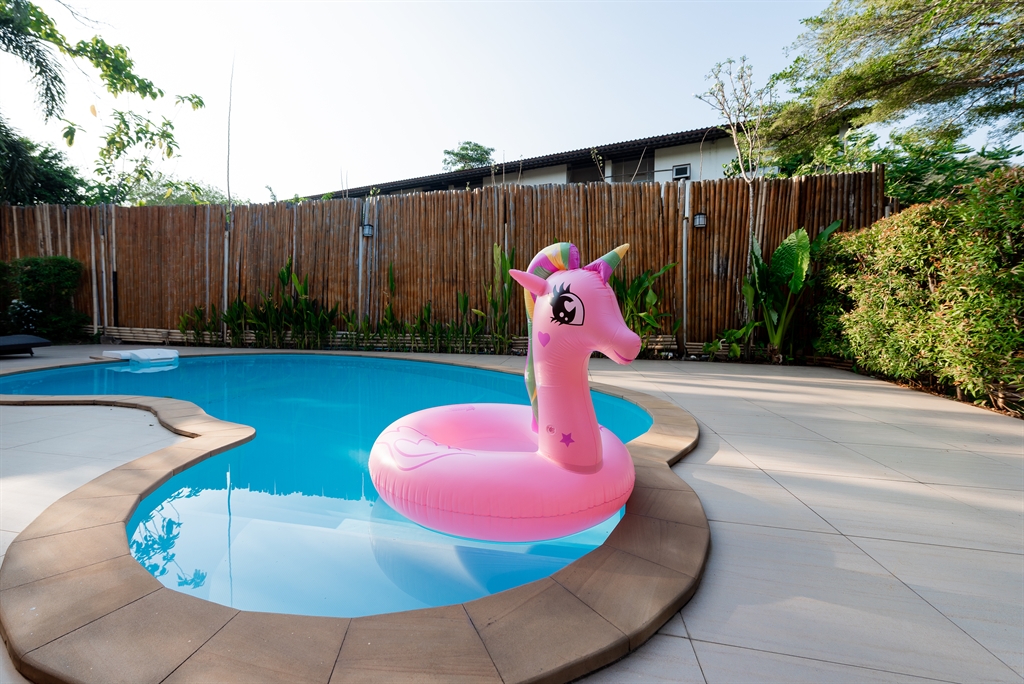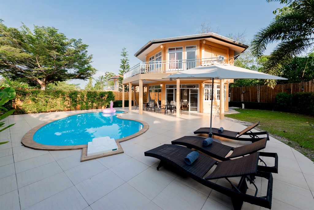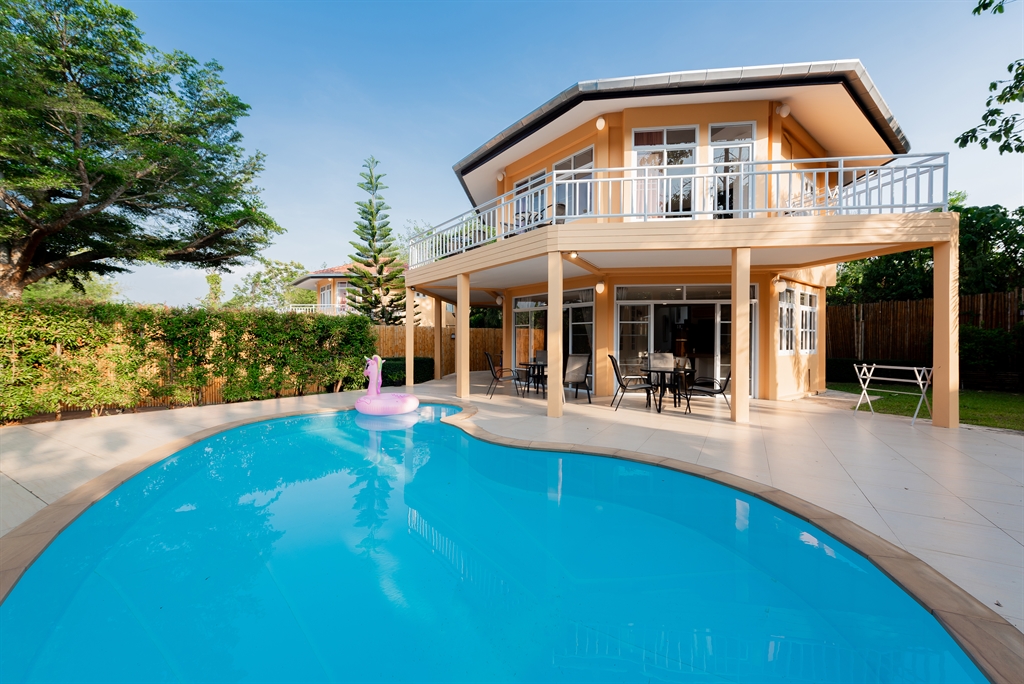 2 Bedrooms : Queensize / Twin + Sofa bed in Living roomTwin Villa enjoys a freeform, kidney shaped, 7 x 4-meter swimming pool with deck in the garden. There is a stepped entry and the pool has varying depth of 1.2 – 1.6m.