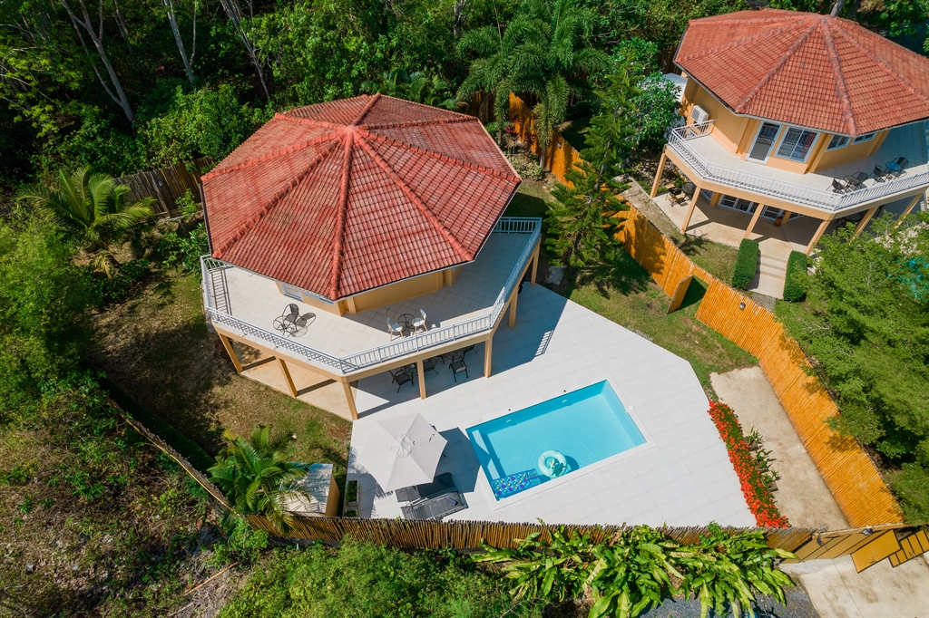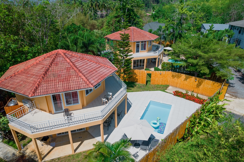 Family holiday home in an unusual package.Sleeps up to Six guests. Ideal for families, groups of friends.The Twin Villas are neighboring two-bedroom, three-bathroom houses within their own private compound. They can be rented separately or together for larger groups. The distinctive octagonal shape of each house gives it a unique feel. The living area downstairs is open plan, with the kitchen and dining area in one half and the lounge in the other.The well-equipped kitchen comes with a curved breakfast bar for five and a formal dining table. Full height French windows around the dining area and lounge open onto a large roofed terrace and garden.The lounge area offers a flat panel TV, Chrome Cast / A ...pple TV and a sofa bed which can sleep one adult or two small children. A small bathroom with shower connected to the living space can serve any additional guests staying down here.Upstairs are two fully furnished bedrooms, one double (queen size bed) and one twin (2 single beds) rooms. The bedrooms connect to a huge wraparound balcony area with lovely mountain views. Each bedroom has a private bathroom a view and an overhead shower. Both Twin Houses have hot water and are air conditioned and served by complimentary Wi-Fi throughout.