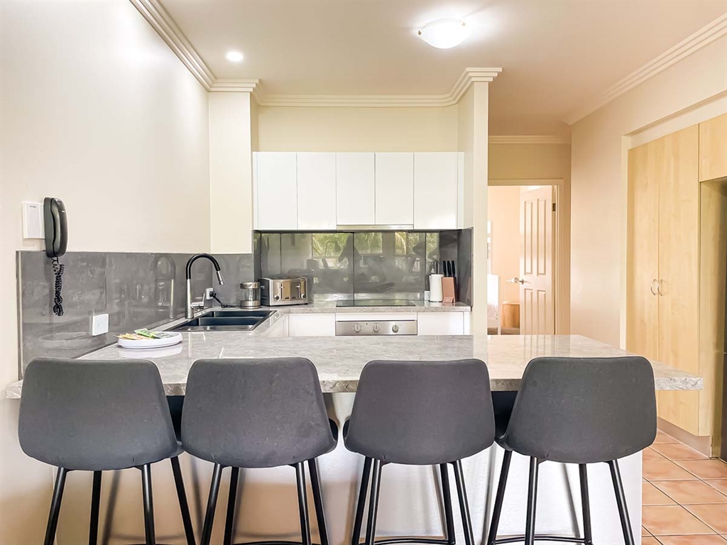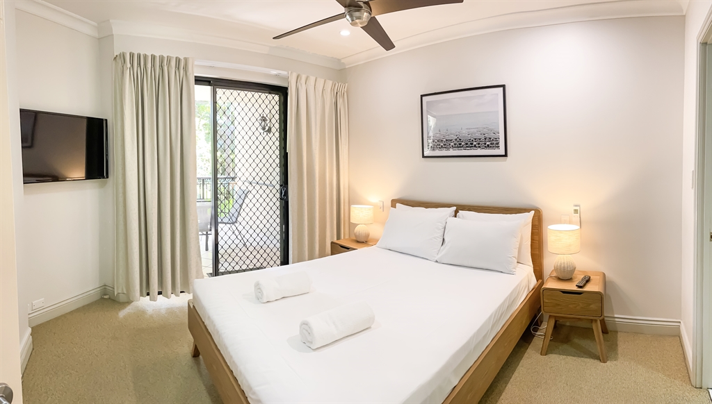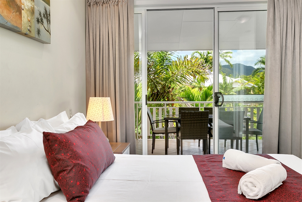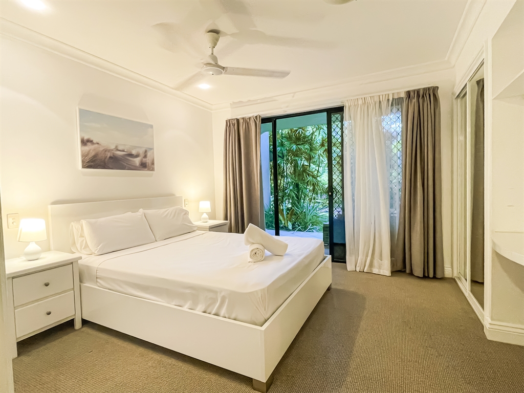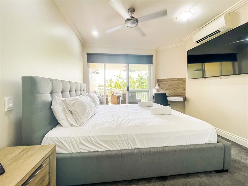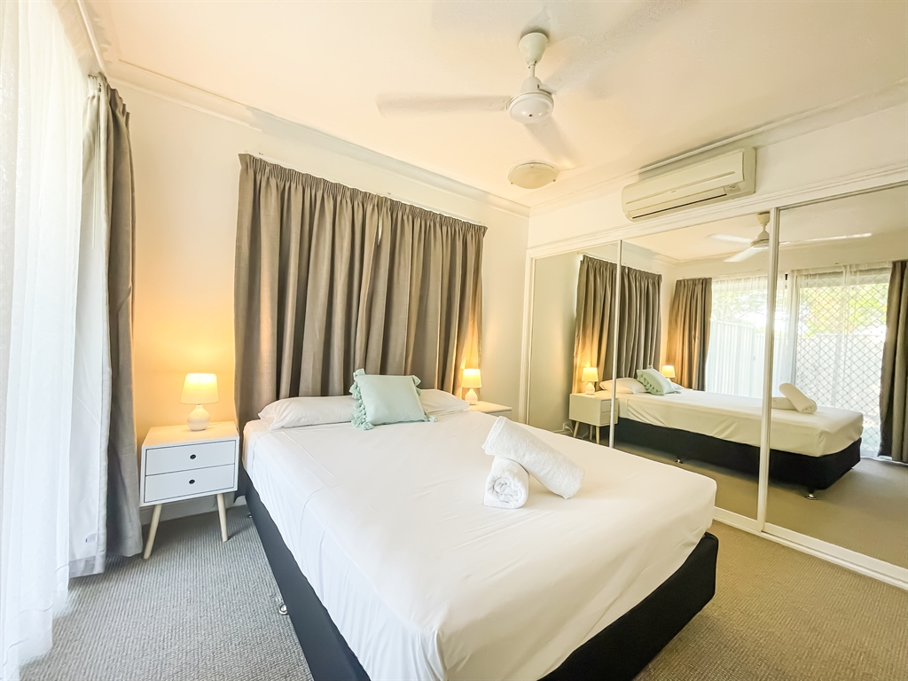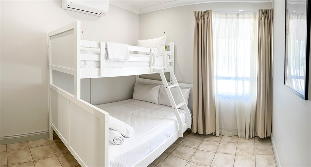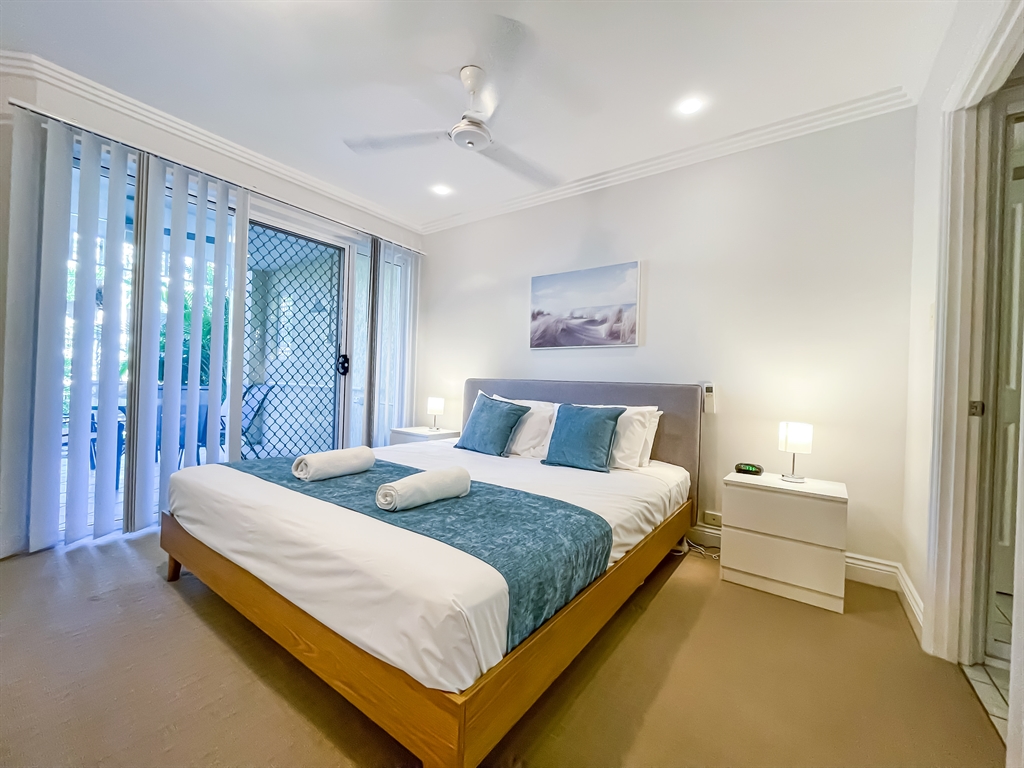 130 sqm • 3 Bedrooms • 2 Bathrooms • 1 Bathtub • Full laundry facilities • Self-contained kitchen • Full-sized fridge • private terrace • Air conditioned • WiFi • Smart TV • Foxtel • DVD & CD player • Hairdryer • Iron/Ironing board • Non-smoking rooms – smoking on terrace only • 10 minutes by car to Cairns CBD.Our generously sized deluxe apartments have been recently refreshed to make your stay that extra special. Combining kitchen, dining and lounge area through an open plan living concept. Bedding configuration, sleeps up to 6 people: 2x Queen beds and 1x bunk bed. 2x bathrooms, 1x bathtub. The spacious balcony is surrounded by tropical palms for the perfect holiday feel.