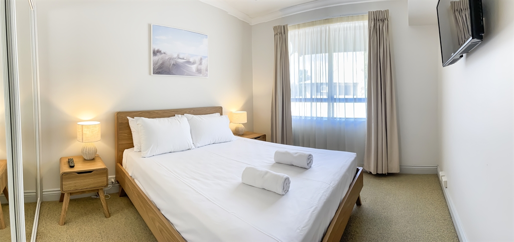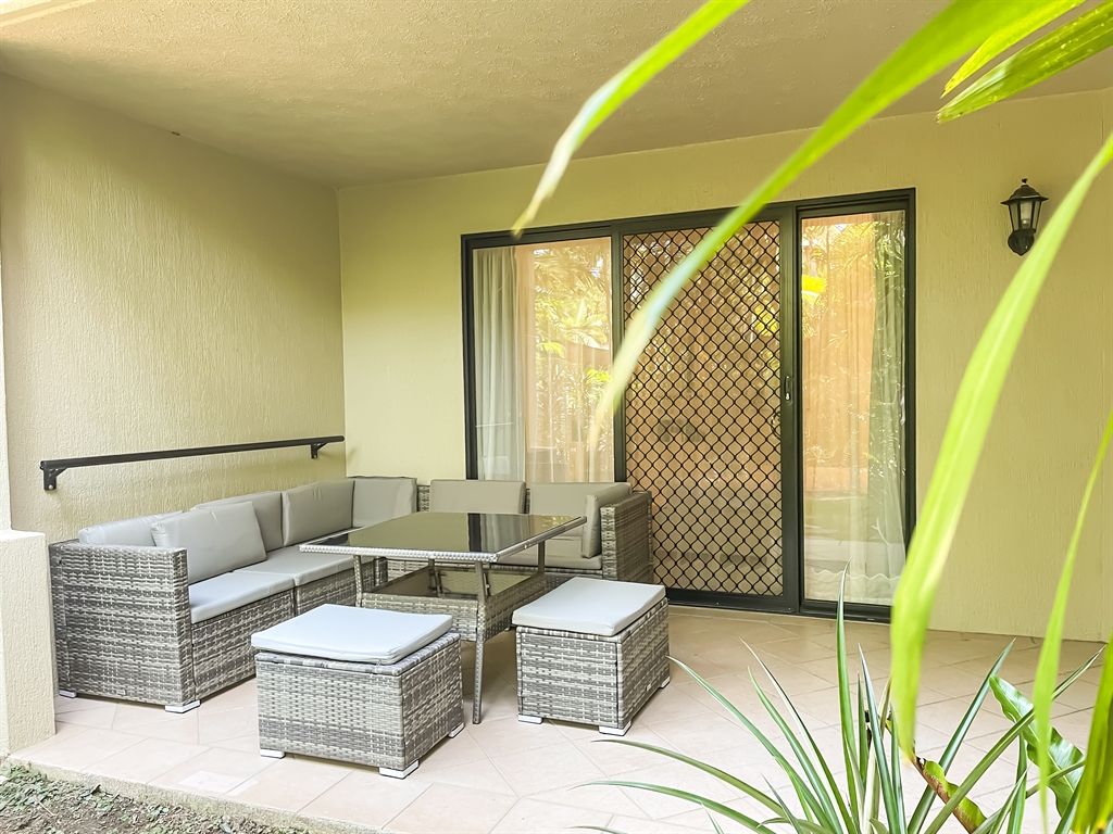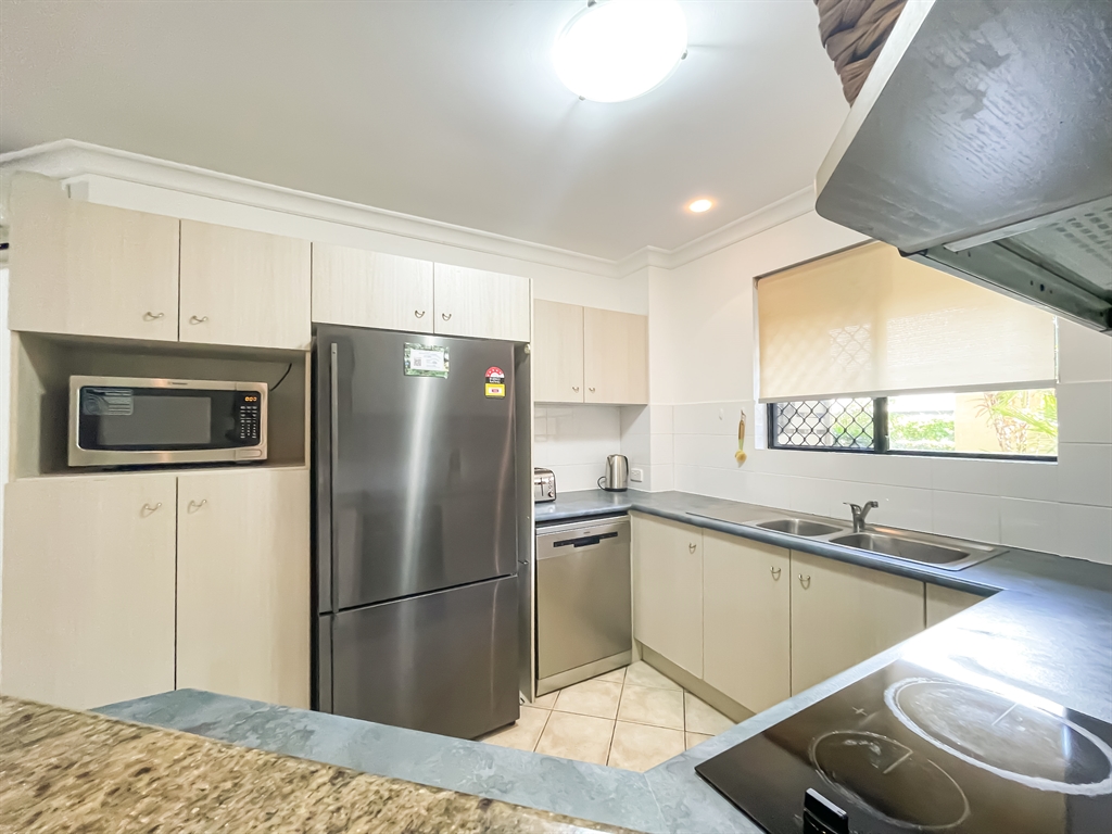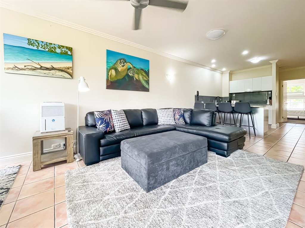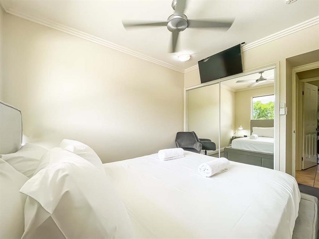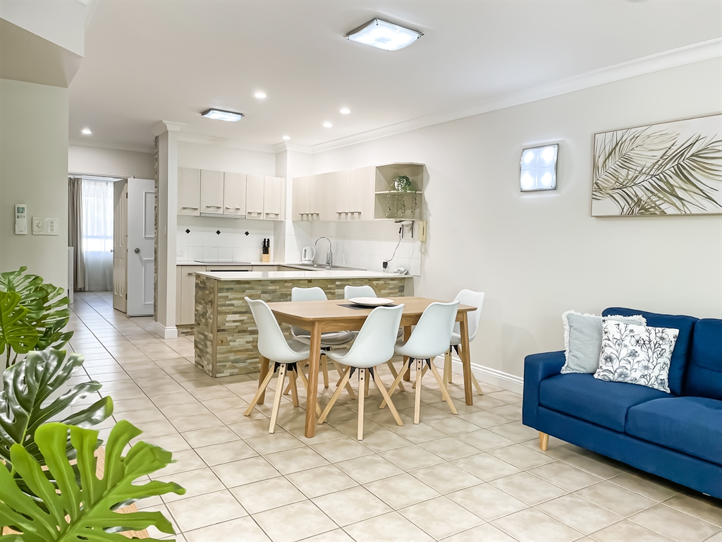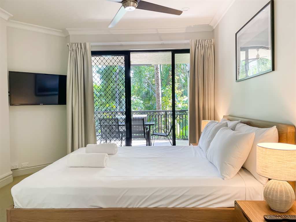 130 sqm • 3 Bedrooms • 2 Bathrooms • 1 Bathtub • Full laundry facilities • Self-contained kitchen • Full-sized fridge • private terrace • Air conditioned • WiFi • Smart TV • Foxtel • DVD & CD player • Hairdryer • Iron/Ironing board • Non-smoking rooms – smoking on terrace only • 10 minutes by car to Cairns CBD.Our generously sized deluxe apartments have been recently refreshed to make your stay that extra special. Combining kitchen, dining and lounge area through an open plan living concept. Bedding configuration, sleeps up to 6 people: 2x Queen beds and 1x bunk bed. 2x bathrooms, 1x bathtub. The spacious balcony is surrounded by tropical palms for the perfect holiday feel.